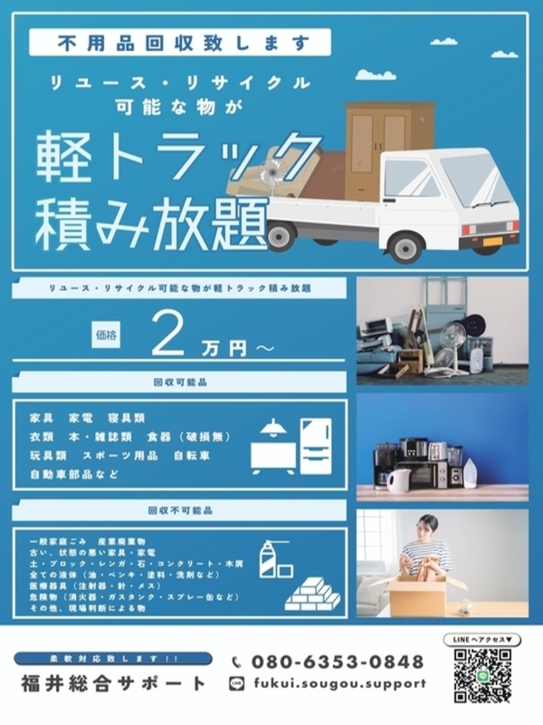 【安心定額!】 リユース・リサイクル可能品に特化することで、圧倒的な低価格を実現! 軽トラックに積めるだけ、まとめて回収いたします。